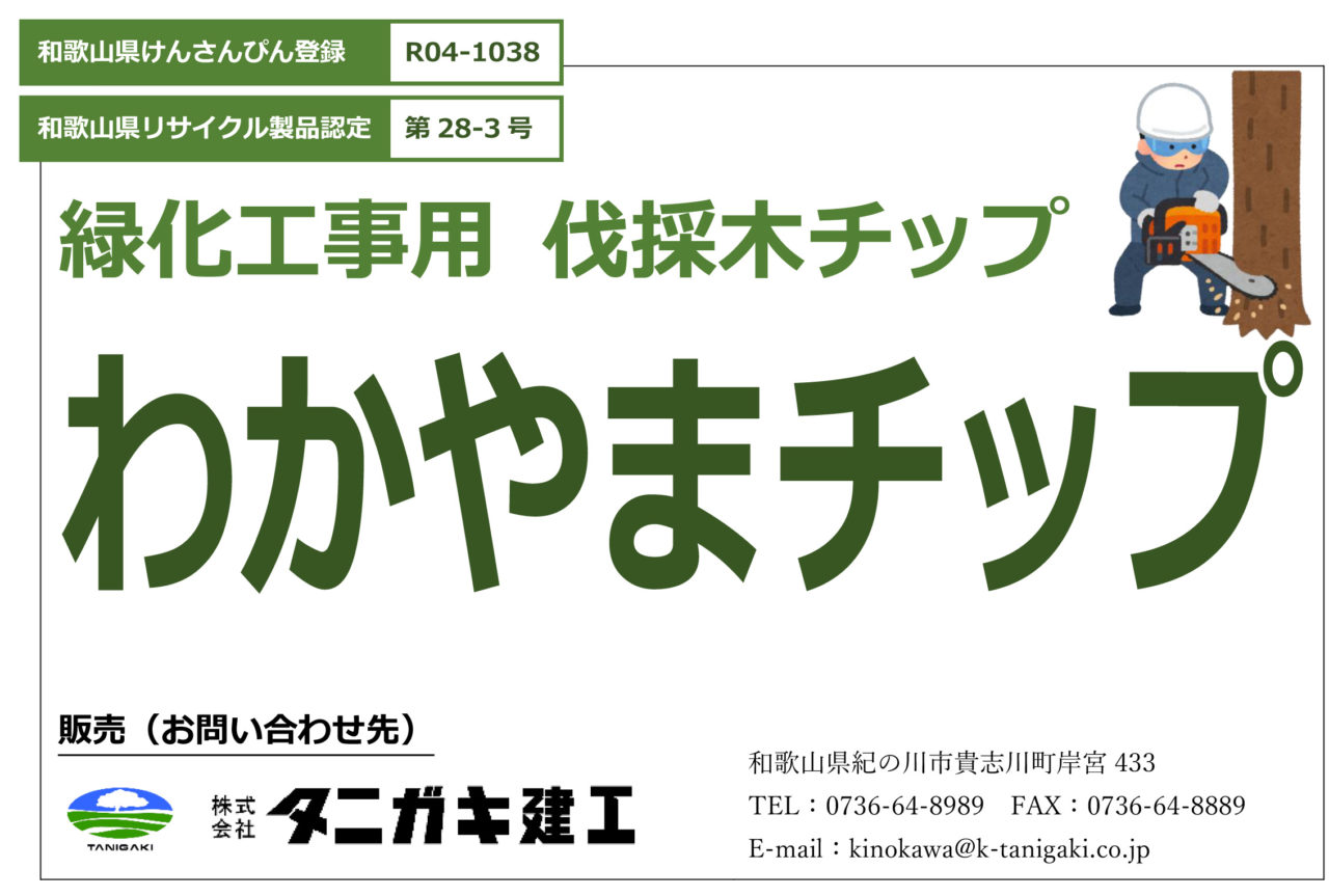 「わかやまチップ」とは、伐採木の幹・根株等を破砕した堆肥化していない生チップ。けんさんぴん登録建設資材。